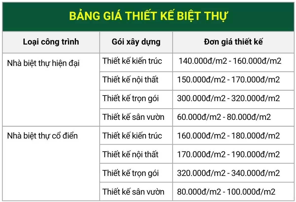 Lưu ý: Đơn giá trên chỉ mang tính chất tham khảo, để biết chính xác chi phí xây dựng nhà biệt thự trọn gói, quý khách hàng vui lòng liên hệ công ty Kiến Trúc Ưu Việt Group để được tư vấn báo giá.