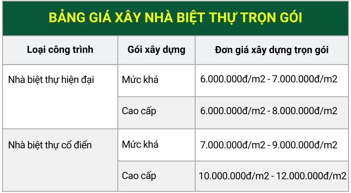 • Xây dựng biệt thự (Cao cấp): 10,000,000 vnđ – 12,000,000 vnđ/m2