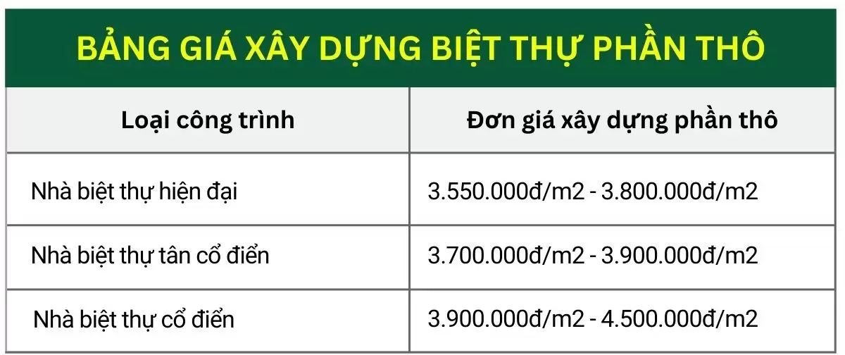 Chi phí xây dựng phần thô biệt thự