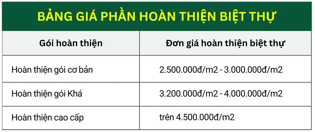 • Gói hoàn thiện biệt thự cơ bản: 2,500,000 vnđ – 3,000,000 vnđ/m2