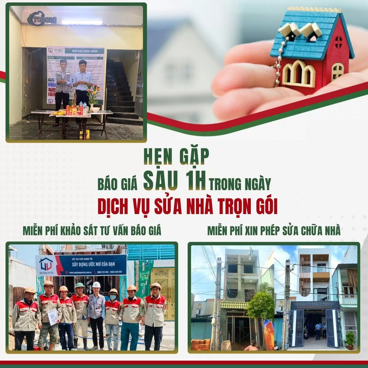 Tiếp nhận thông tin khách hàng: có mặt chỉ trong 30 phút khi nhận được yêu cầu, tiếp xúc và lắng nghe khách hàng, dành thời gian để hiểu rõ yêu cầu và ý tưởng của khách hàng về việc sửa nhà. Tư vấn đầy đủ, rõ ràng, thân thiện, sâu sắc.