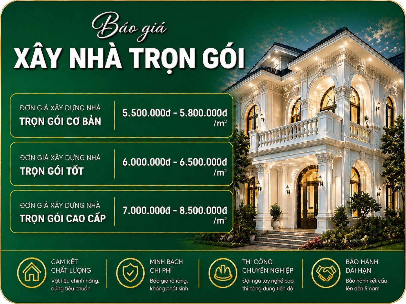 • Xây nhà trọn gói: 5,950,000đ – 6,750,000đ/m2 (Khá ++)