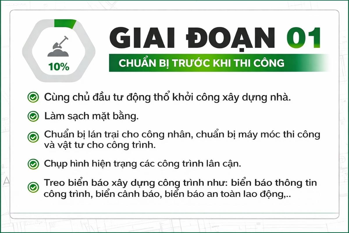 Dọn dẹp mặt bằng, chuẩn bị lán trại cho công nhân, máy móc thi công và vật tư cho công trình. Cùng chủ đầu tư động thổ khởi công xây dựng nhà.