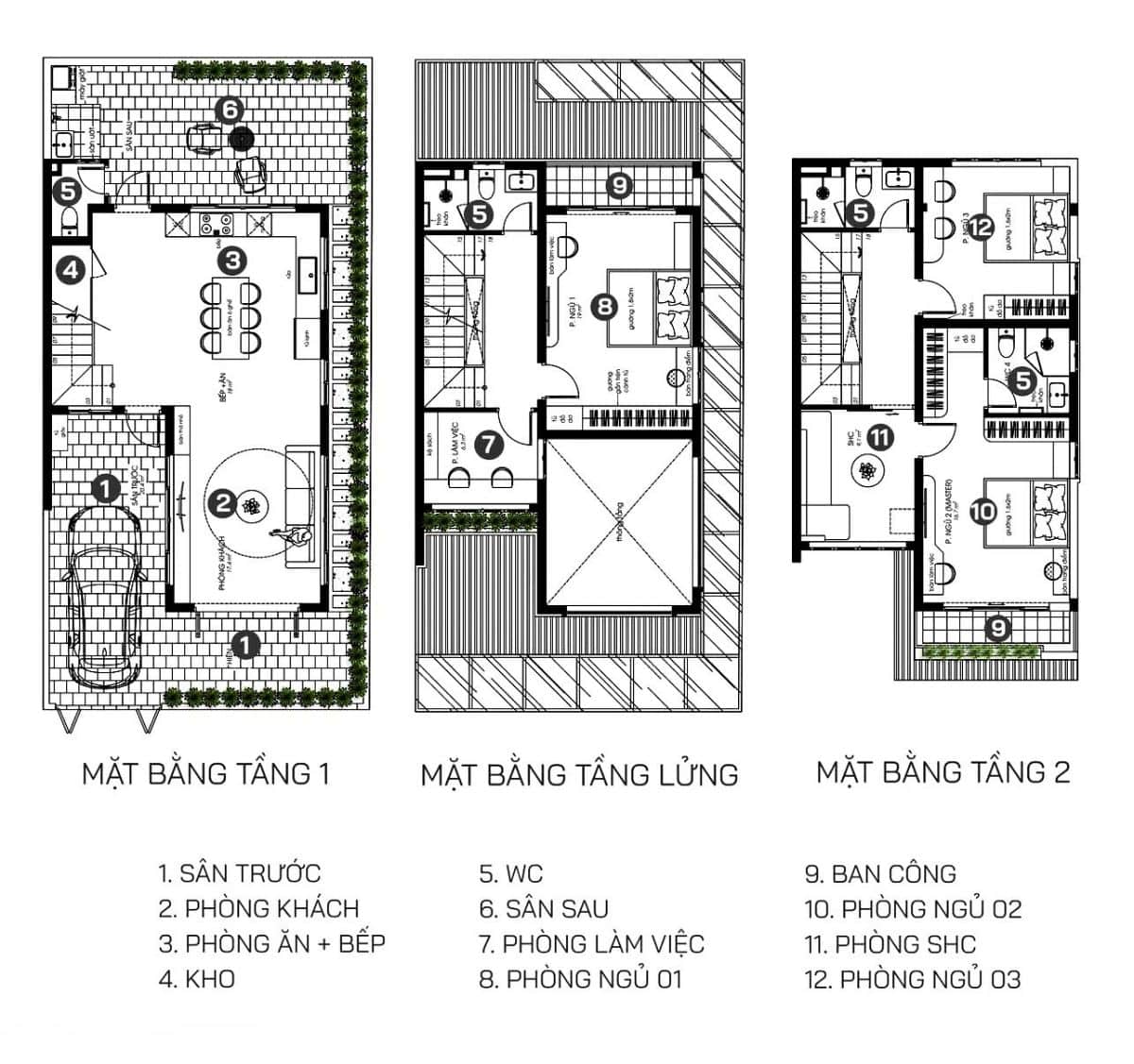 - Trệt: Phòng khách, Khu vực bếp + phòng ăn, nhà vệ sinh, sân trước