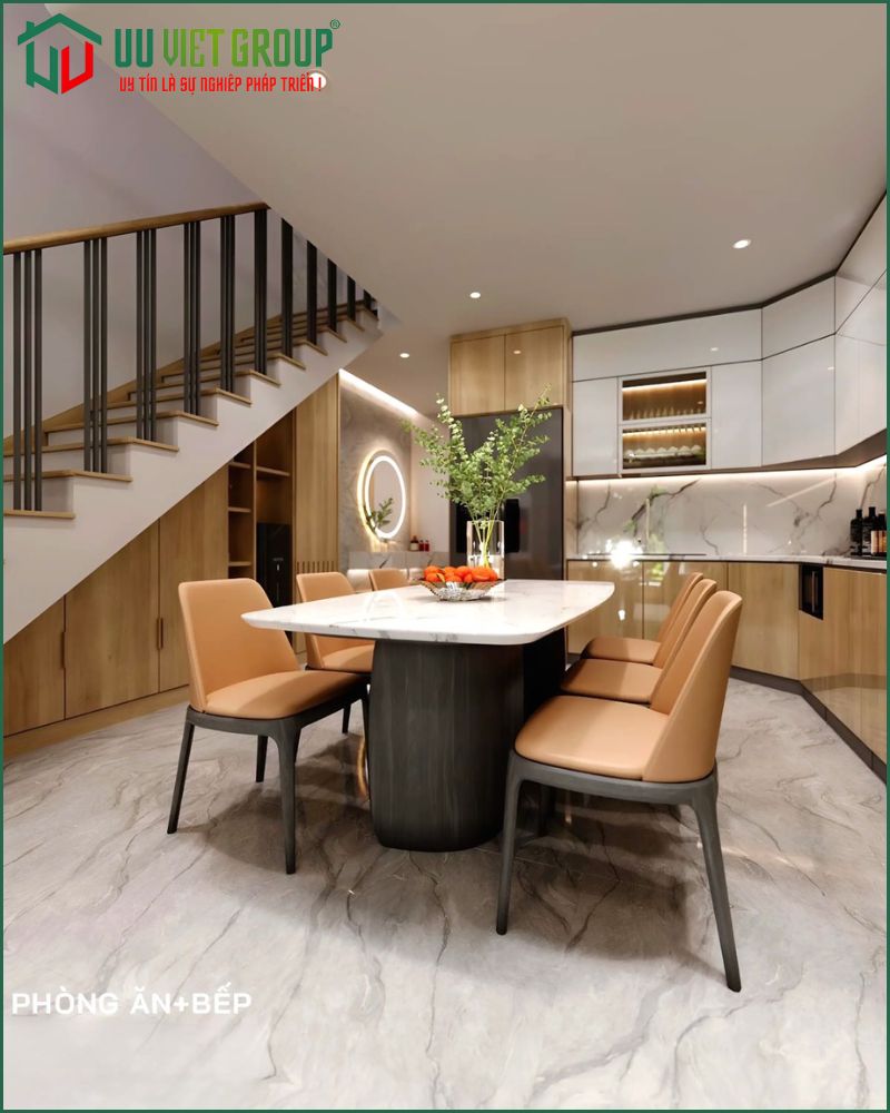 Mẫu nhà phố 1 trệt 2 lầu được thiết kế phong cách kiến trúc sang trọng, tinh tế. Với không gian mở, rộng rãi, thoáng mát, bố trí hài hoà, khoa học, giúp gia đình tận hưởng những tiện nghi hiện đại.