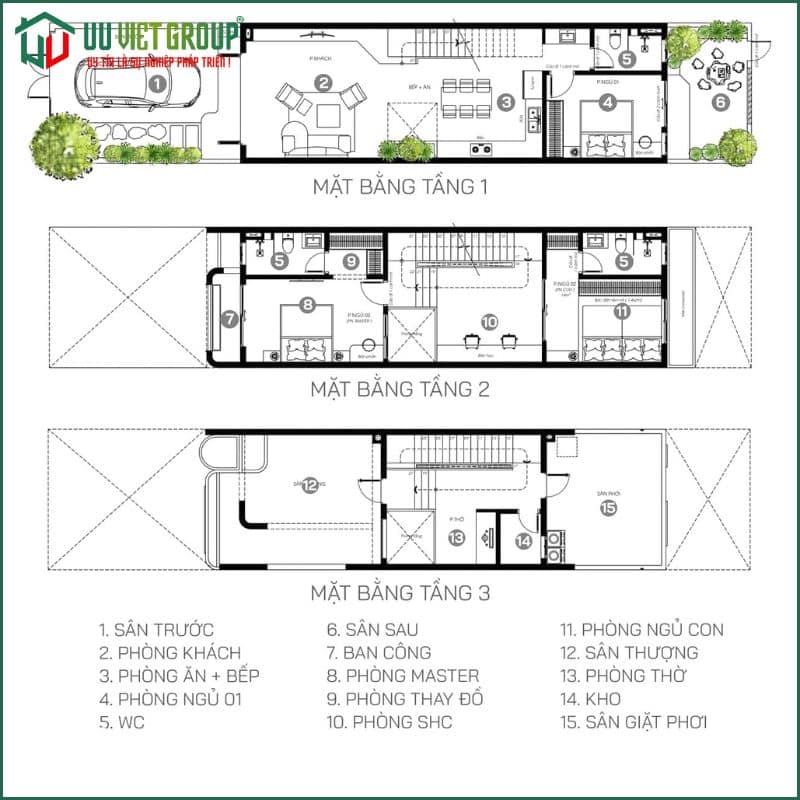 - Lầu 1: Không gian sinh hoặt chung, 3 phòng ngủ, nhà vệ sinh.