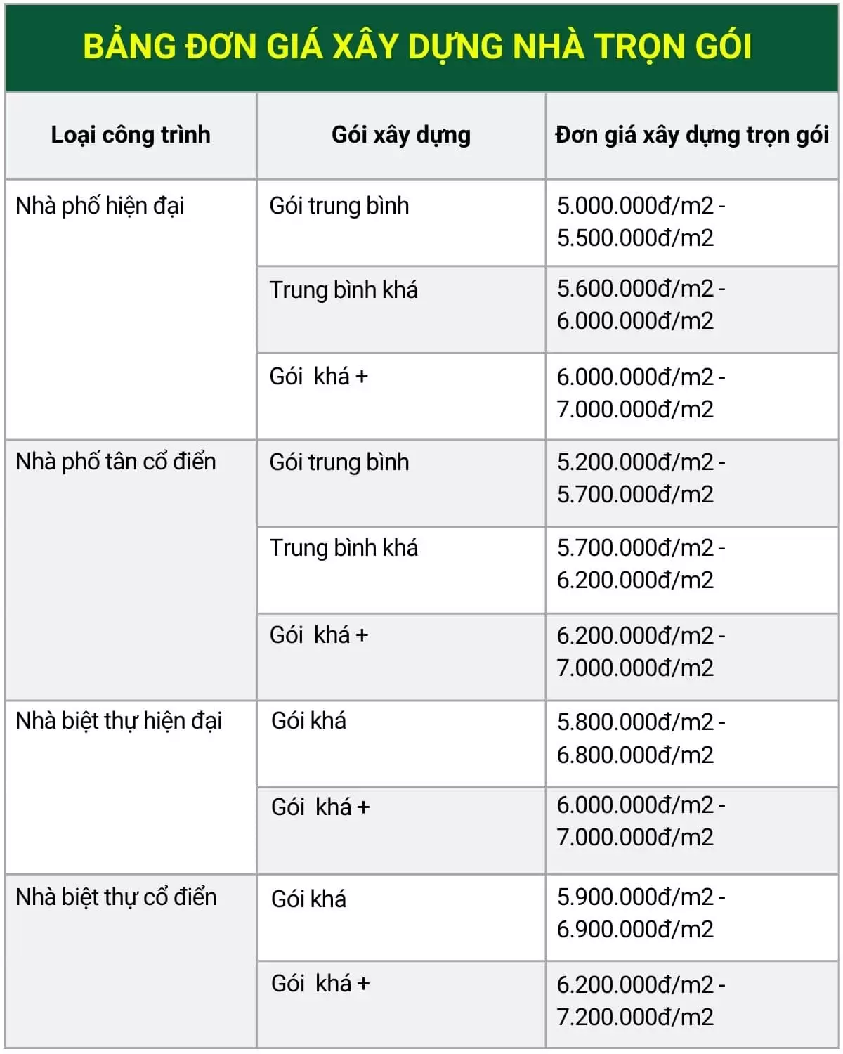 - Gói trung bình từ: 4,950,000đ – 5,250,000đ/m2